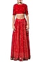 Featuring a red crop top in lucknowi silk base with 3/4th sleeves, round neck and embroidery. It is paired with matching lehenga skirt with embroidered border and tassel paired with a textured.