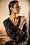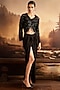 Featuring a black short jacket in silk and organza base with cutdana and sequin embroidery. It is paired with a draped skirt. Style this set with statement earrings, high heels and a sling bag. Complete the look with soft glam makeup and a sleek hairdo for your sangeet, festive or reception ceremony