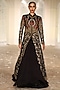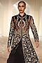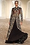 Rohit Bal presents a black long jacket in velvet base with embroidery. Accentuate it with a skirt, polki stud earrings and block heels for weddings or sangeet nights.
