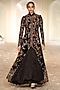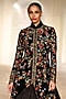 Rohit Bal presents a black long jacket in velvet base with embroidery. Accentuate it with a skirt, polki stud earrings and block heels for weddings or sangeet nights.