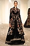 Rohit Bal presents a black long jacket in velvet base with embroidery. Accentuate it with a lehenga, a sleek bun, polki stud earrings and block heels for weddings or sangeet nights.