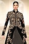 Rohit Bal presents a black long jacket in velvet base with embroidery. Accentuate it with a skirt, a jalabiya, a sleek bun, gold stud earrings and block heels for weddings or sangeet nights.
