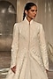 Rohit Bal presents an ivory long jacket in matka silk base with embroidery. Accentuate it with an anarkali, polki stud earrings and block heels for weddings or sangeet nights.