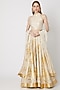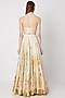 Featuring an ivory lehenga skirt in chanderi base with golden leaf print. It is paired with a matching blouse and dupatta.