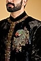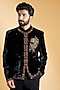 Featuring a black bandhgala in silk velvet base. Style it with pants and loafers for a festive occasion, sangeet or engagement ceremony, exuding charm and elegance.