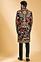 Featuring a black sherwani in silk velvet base. Style it with pants and loafers for a wedding, sangeet or engagement ceremony, exuding charm and elegance.