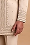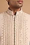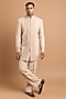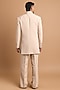 Featuring a beige indowestern in polo fabric base with handwork. It is paired with pants. Style it with mojaris and malas for a wedding, engagement or sangeet ceremony.
