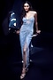 Featuring an aqua blue gown saree in tulle base with linear geometric artwork, cutout details, slit and slender shoulder straps. Team with up dangler earrings and stilettos, great for wedding or cocktail ceremonies.