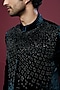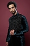 Featuring a blue bandhgala jacket in velvet base with embroidery. It is paired with contrasting pants.