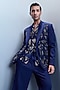 Featuring a navy structured jacket in felt fabric base with geometric embroidery. It is paired with pants. Style it with pair of loafers and a bracelet for a sangeet or cocktail ceremony.