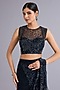 Featuring a navy blue pre-draped gown saree in tulle base with sequin embellishments. It is paired with a blouse having a sheer neckline. Pair with statement danglers and stilettos for a glamorous appeal, Perfect for cocktail nights, receptions, or evening galas.
