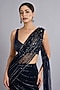 Featuring a navy blue draped saree in viscose crepe base with handcrafted floral and geometric motif detail, including 3D crystal and sequins embellishments. It is paired with a blouse. Accentuate it with statement jewellery and heels for a wedding, sangeet ceremony or cocktail soirees.