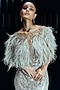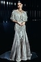 Featuring a silver gown in tulle, lame, viscose crepe base with floral embroidery, sequins and crystal bead embellishments. It is paired with a tulle cape. Accentuate it with diamond earrings and block heels for cocktail soirees.
