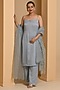 Featuring a powder blue short kurta in shimmer chiffon base with beaded straps. It is paired with matching straight pants and a mukaish organza dupatta.