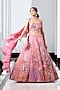 Featuring a french rose lehenga in net, organza and satin base with applique patchwork, shell sequins and bead embroidery. It is paired with a matching embroidered blouse and a ruffled dupatta.