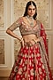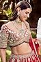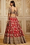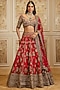 Roqa presents a deep red lehenga in raw silk base with golden thread embroidery. It is paired with a raw silk embroidered blouse and a net dupatta. Elevate your bridal look with statement polki jewellery, a sleek bun, and bold makeup, perfect for pheras, receptions, and traditional wedding rituals.