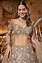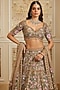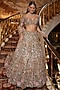 Roqa presents a golden lehenga in net base with zari, sequins, motif and beads and majestic peacock embroidery in lattice pattern. It is paired with an embroidered blouse having a sweetheart neckline and a sheer dupatta. Elevate your bridal look with statement polki jewellery, a sleek bun, and bold makeup, perfect for pheras, receptions, and traditional wedding rituals.