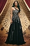 Featuring a midnight blue one-shoulder gown in net and shimmer organza base with floral and beads embellishment. Accentuate it with zircon or swarovski jewellery and embellished heels for a sangeet or cocktail ceremony.