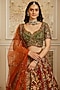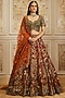 Roqa presents a red lehenga in net base with resham, sequins, zari and stone embroidery. It is paired with an embroidered blouse having a sweetheart neckline and a burnt orange dupatta. Elevate your bridal look with statement polki jewellery, a sleek bun, and bold makeup, perfect for pheras, receptions, and traditional wedding rituals.