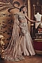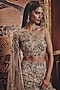 Featuring a silver lehenga in shimmer organza base with beads and floral hand embellishment. It is paired with a net embellished corset blouse having an attached drape. Accentuate it with polki or pearl jewellery and block heels for a wedding or sangeet ceremony.