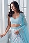 Featuring a firozi blue lehenga in viscose dull satin base with hand work. It is paired with an embroidered blouse and a dupatta. Style these intricately embroidered lehengas with zircon jewellery and a sleek bun to balance the rich hues of the ensemble, perfect for weddings, sangeet or engagement ceremonies.