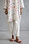 Featuring an ivory kurta in linen base with beaded buttons, floral motifs and lace detailing. It is paired with tapered salwar pants. Accentuate it with statement jewellery and heels for festive ceremonies.