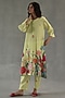 Featuring a lemon yellow kurta in feather linen base with floral motifs detail and watercolor floral print. It is paired with pants. Style it with traditional juttis, a potli bag, and statement earrings to complete the ethnic look, ideal for festive gatherings, cultural events, or family celebrations.