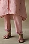 Featuring a pink A-line kurta in gauze linen base with floral details. It is paired with a matching cotton slip and linen pants.