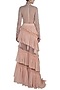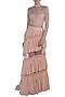 Featuring a peach blouse in net base with hand embroidery. It is paired with matching layered skirt.