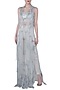 Featuring a sky blue front open jacket in net base with crystal and tassel hand embroidery all over. It is paired with a grey crushed bustier and off white straight pants in dupion silk base.