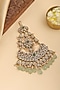 Featuring a gold finish pasa studded with kundan polki, pearls and green stones, set in brass. It has a hook closure. Accentuate this elegant jewellery set with your look for a polished finish, ideal for festive functions, family gatherings or wedding celebrations.