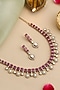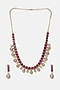 Featuring a gold finish necklace studded with kundan polki, pink and white gemstones, set in brass. It is paired with a matching pair of earrings. It has a lobster claw closure. Accentuate this elegant jewellery with your look for a polished finish, ideal for festive functions, family gatherings or wedding celebrations.