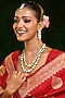 Featuring a gold finish layered necklace studded with red meenakari kundan polki, set in brass. It is paired with a matching pair of earrings and a maangtikka. Accentuate this elegant jewellery set with your look for a polished finish, ideal for festive functions, family gatherings or wedding celebrations.