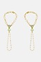Featuring a pair of gold finish haathphool for girls, studded with glass kundan, pearls and green stones, set in metal. Perfect wear for a festive occasion or a wedding ceremony.