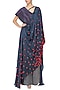Featuring a navy blue duo drape palla dress in raw silk and habutai base with faggoting and tassel detailing.