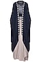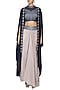 Featuring a navy blue draped cape in satin base. It is paired with matching gathered honeycomb collared blouse in organza base and belt knotted skirt in habutai base.