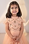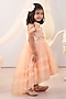 Featuring a peach high-low gown for girls in bridal satin and tulle base with hand embroidery. It is paired with a hair accessory. Accessorize it with a cute sling bag and sandals for a stylish ensemble, ideal for any festive occasion or birthday party.