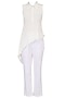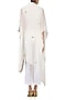 This set features an ivory cape in silk georgette base with gold embroidery on the side front and bootis scattered all over. It is paired with an ivory linen shirt and pants.
