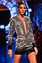 Featuring a gunmetal and black mini dress in tulle and plastic sequins trim base with a plunging neckline, including hand and machine embroidery.
