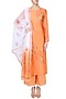 This set features an orange straight kurta in chanderi base embroidered with white and gold shaded bird motifs on the front. It is paired with orange block printed modal silk palazzos and white block printed kota dupatta.