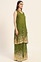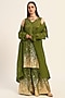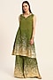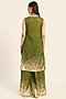 Featuring a green A-line kurta in silk chanderi base with foil print. It is paired with flared palazzo pants. Accentuate it with statement jewellery and heels for a festive occasion, mehendi or sangeet ceremony.
