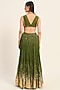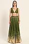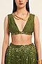 Featuring a green hand micro pleated skirt in silk chanderi base with foil print. It is paired with a bralette having a plunging neckline. Accentuate it with statement jewellery and heels for a festive look.
