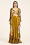 Featuring an ochre yellow cape in satin chiffon base with abstract floral digital print, shell and tassel detailing. It is paired with an overlap-style bralette and a pre-draped skirt. Style it with statement jewellery and heels for a festive occasion, cocktail or sangeet ceremony.