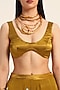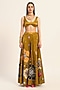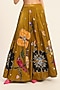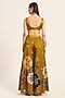Featuring an ochre yellow blouse in satin chiffon base with digital print, hand embroidery and abstract floral artwork. It is paired with sharara pants. Style it with statement jewellery and heels for a festive occasion, cocktail or sangeet ceremony.