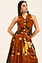Featuring a rust orange waistcoat in dola silk base with digital print. It is paired with a box pleated skirt. Accentuate it with statement jewellery and heels for a festive look.