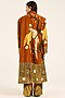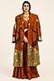 Featuring a rust orange overcoat in raw silk base with digital print, patchwork and mirror hand embroidery. Accentuate it with a pant set, statement jewellery and heels for a complete look.