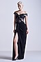 S&N by Shantnu Nikhil features a black off-shoulder corset gown saree in jersey base with texture detailing and a high slit. Style it with silver or swarovski jewellery and metallic heels for cocktail party, dinner or evening soiree.