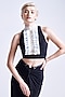 S&N by Shantnu Nikhil features a black sculpted crop top in jersey base with a high-neckline, dramatic ruffed bib and pearl detailing. Style the top with a skirt, silver or swarovski jewellery and metallic heels for cocktail party, dinner or evening soiree.