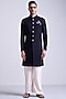 S&N by Shantnu Nikhil Men features a black sherwani crafted in a poly blend viscose lycra fabric with a band collar, golden buttons and adamas pintucks detailing. Accentuate it with tailored trousers and mojris for a refined and contemporary look. Perfect for wedding, sangeet or engagement ceremony.