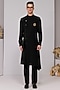 Featuring a black kurta in terylene viscose lycra base with faux leather embroidery. Accentuate it with pants and a pair of mojaris for a festive occasion or sangeet ceremony.